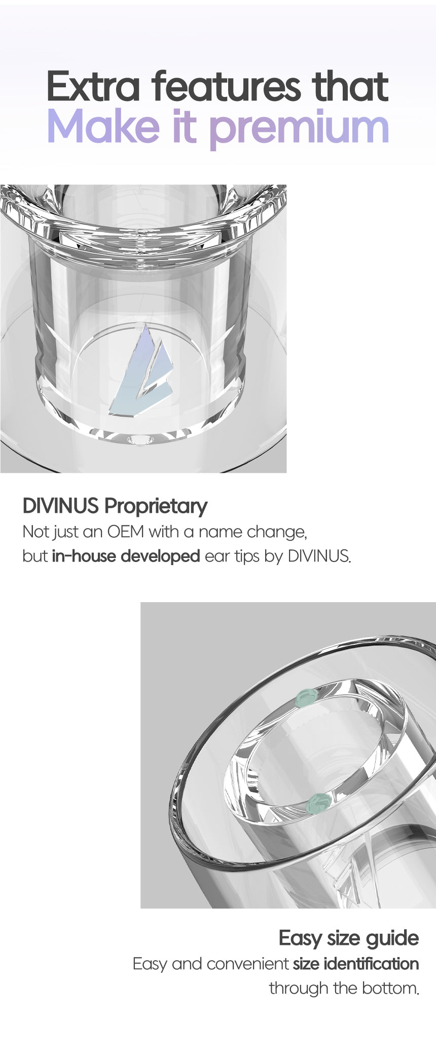 Divinus Prism ear tips combine medical-grade safety with audiophile-grade sound enhancement. Their wide bore design delivers a spacious soundstage with enhanced bass and treble, while the deep center design ensures stability and comfort. Easy to clean and available in multiple sizes, these ear tips are the perfect upgrade for your IEMs.
