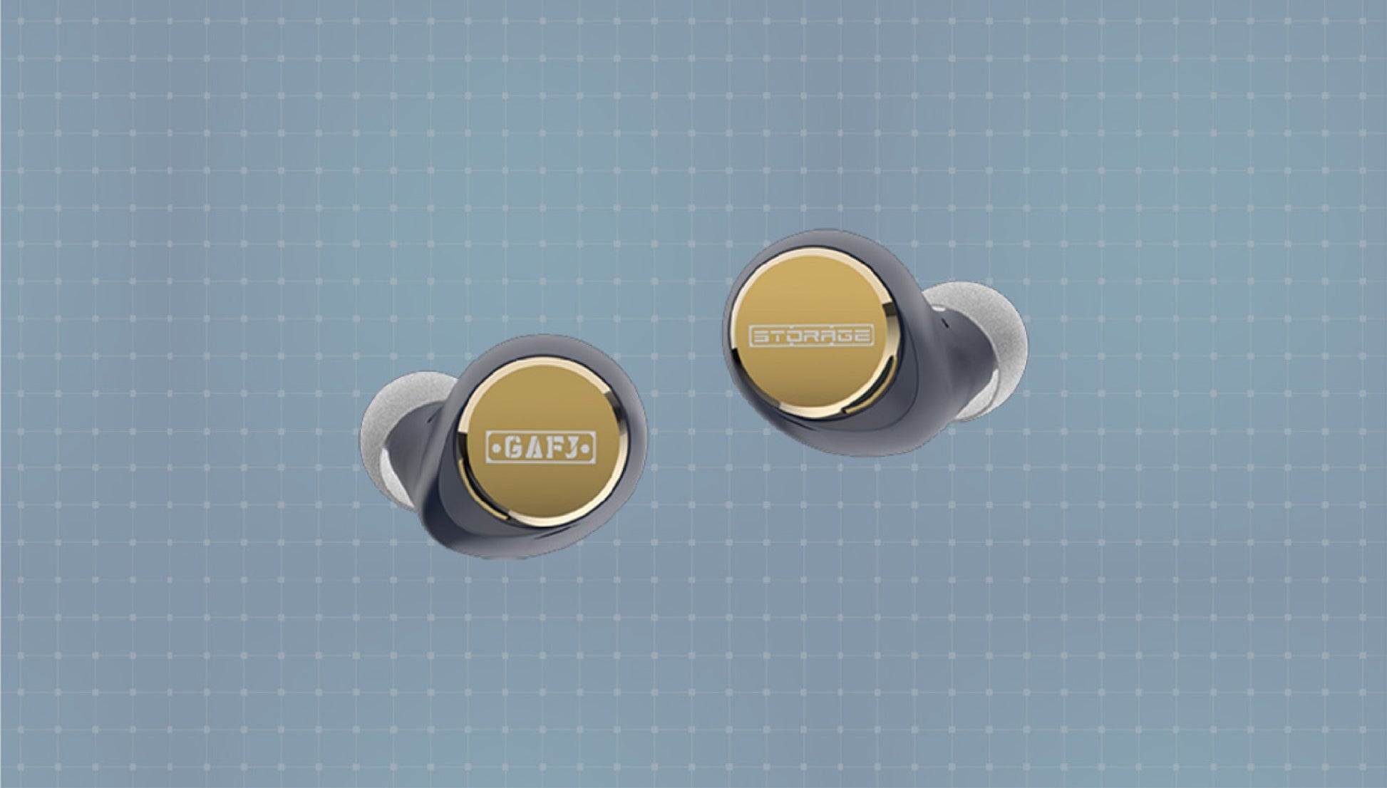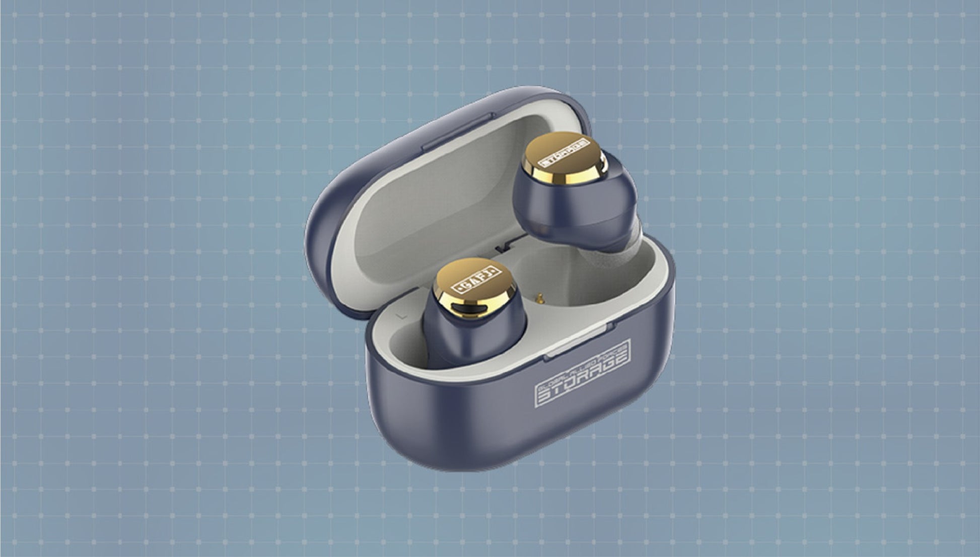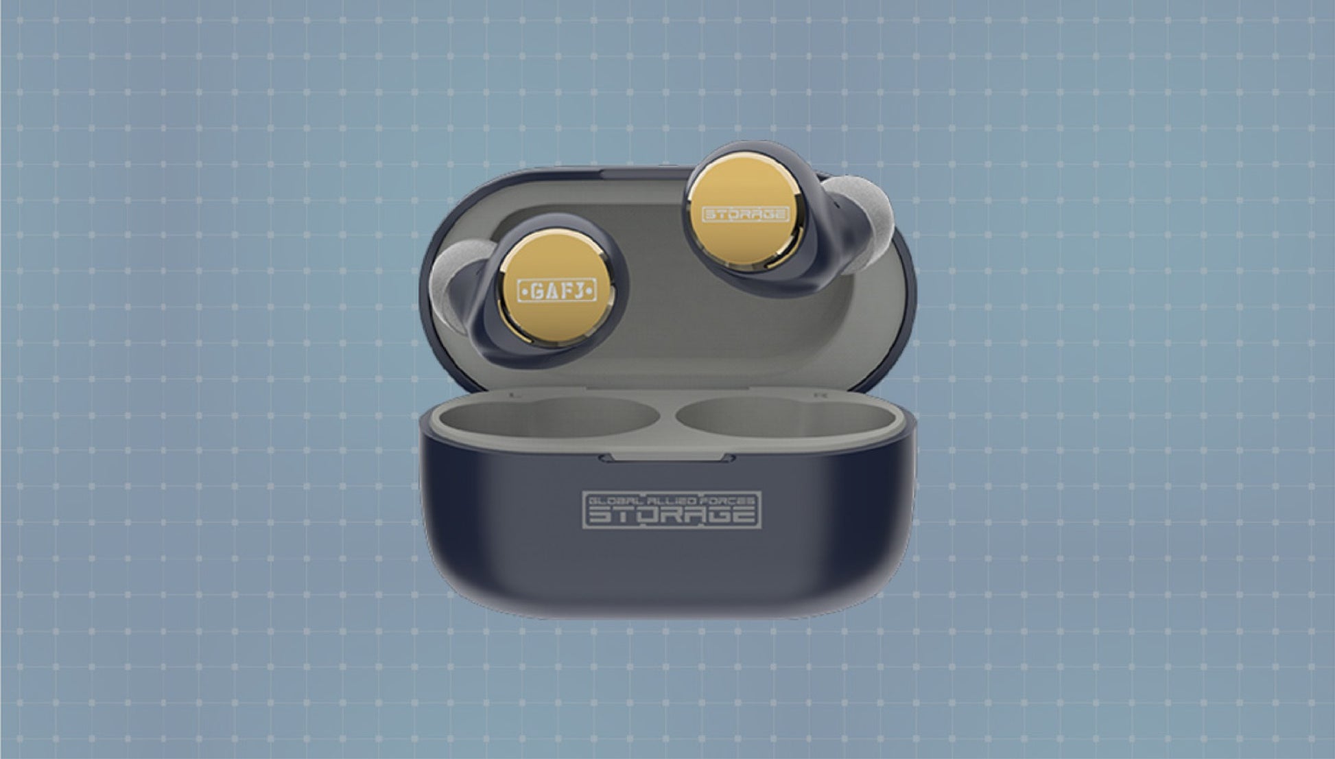 • Earbuds and charging case adorned with military-inspired “STORAGE” emblems and Ultraman motif gold accents.